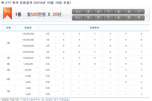 당첨금 1억원을 받는 2등 당첨번호는 2조 447046번, 2조 447048번과 2조 997605번, 2조 997607번 등 4명이다.