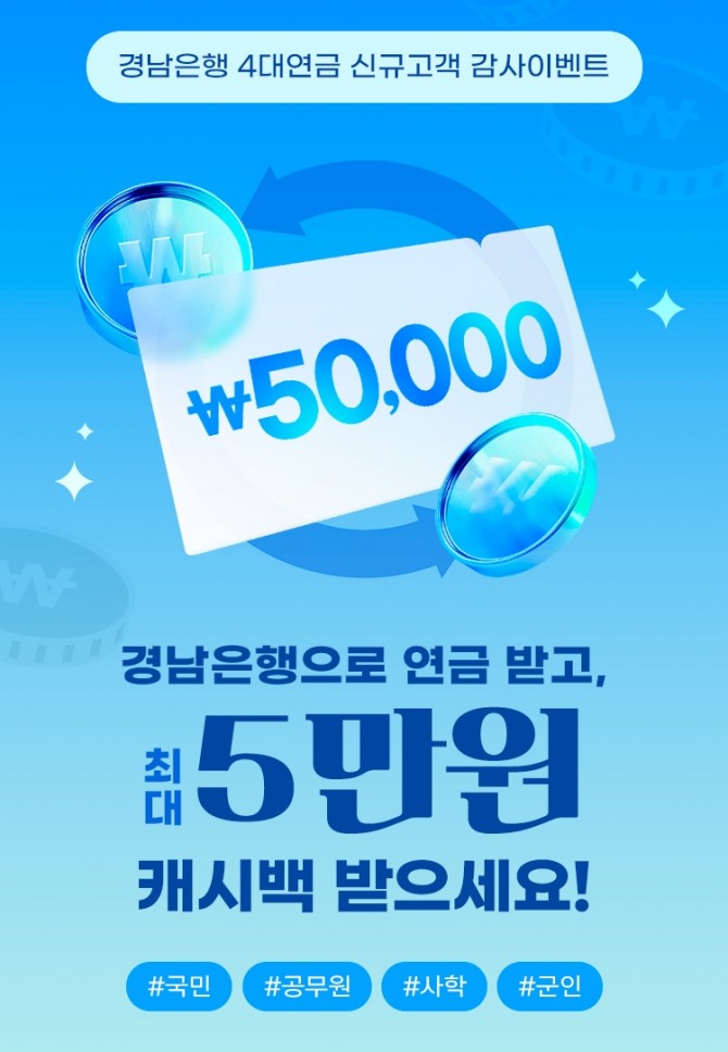 이미지 확대보기이벤트 기간 동안 국민연금ㆍ공무원연금ㆍ사학연금ㆍ군인연금 4대 연금을 BNK경남은행 계좌로 신규 수령하거나 다른 은행에서 BNK경남은행으로 연금수령계좌를 변경해 수령한 고객을 대상으로 캐시백을 지급한다.