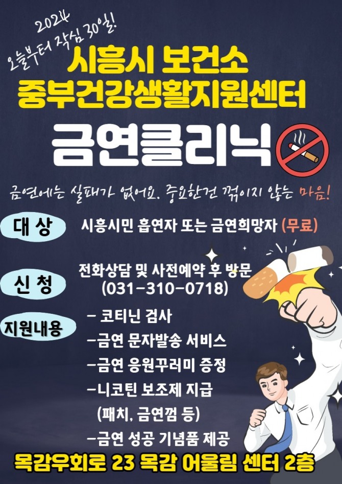 금연 클리닉 관련 문의는 시흥시보건소 중부건강생활지원센터 금연상담실로 하면 된다.