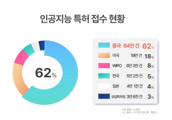 지난 5년 동안 전 세계 50개국 이상에서 인공지능 분야 관련 특허 115만 건이 출원됐다. 국가별로는 중국, 미국, 한국 3개국이 각각 64만8000건, 19만1000건, 5만2800건으로 최상위권을 차지했다.