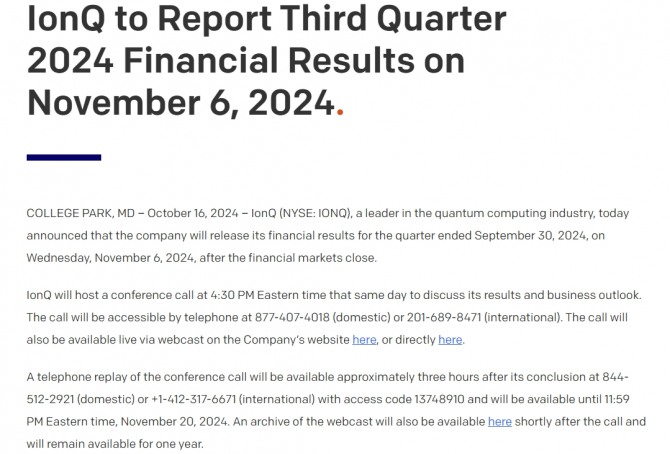 아이온큐 주가는 실적발표 후 급등했다. 예상밖 매출 증가라는 실적발표 결과가 나오면서 드디어 양자컴퓨팅에 봄이 오는 것인가 하는 기대가 아이온큐와 양자컴퓨팅관련 종목의 주가 급등을 몰고왔다. 아이온큐의 3분기 매출이 제시된 가이던스의 상단 및 월가 예상치를 넘어서고 연간 매출 가이던스도 상향되며 주가를 밀어 올렸다. 양자 컴퓨팅 기업 아이온큐(IONQ) 3분기 실적 발표에 따르면 2024년 3분기에 매출 1240만 달러를 기록했다. 전년 동기 대비 102% 능어났다. 3분기 신규 계약은 6350만 달러에 달했다. 일각에서는 매출이 늘었지만 아직도 영업익측면에서는 여전히 부진하다는 판단이 나오면서 아이온큐 주가가 큰 폭으로 떨어지기도 했다. 아이온큐 3분기 순손실은 5250만 달러, 조정 EBITDA 손실은 2370만 달러로 나타났다.