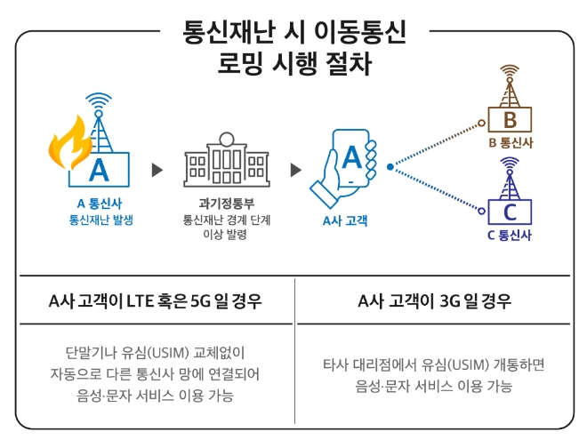 통신 재난 발생 시 통신 재난 경보가 발령되며 재난이 발생한 특정 통신사의 5G/LTE 고객은 별도의 조치없이 다른 통신사의 LTE망을 통해 음성통화, 문자 등 이동통신 서비스를 이용할 수 있다. 단말기나 유심 교체 없이 바로 가능하다.