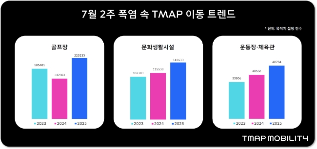 이미지 확대보기티맵모빌리티는 최근 3년 동안의 '7월 1일부터 14일까지' 2주간의 주행 데이터를 비교 분석한 결과, 올해는 백화점·복합 쇼핑몰보다 경험 중심의 문화·레저시설 이동 증가 폭이 는 것으로 집계됐다.