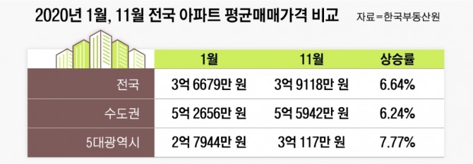 22일 한국부동산원(옛 한국감정원)에 따르면, 전국 아파트 평균매매가격은 지난 11월 기준 3억 9118만 원으로 올해 연초인 1월 3억 6679만 원과 비교해 2439만원(6.64%) 올랐다. 지난해 연초 대비 연말 전국 아파트 매매거래 가격이 -0.39%(3억 4942만 원→3억 4803만 원)를 기록해 극명한 대조를 보였다.