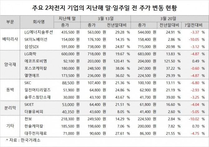 SK이노베이션의 주가는 15만8400원으로 일주일간 10.05% 내렸고 지난해 말보다 2.86% 올랐습니다. 삼성SDI의 주가는 71만5000원으로 일주일 새 3.12% 내렸고 작년말보다 20.98% 뛰었습니다.