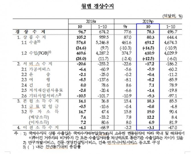 상품수지는 80억3000만 달러 흑자였다. 다만 지난해 10월(105억2000만 달러)보다 24억9000만 달러 급감했다. 상품수지 흑자 규모는 올해 1월부터 10월까지 기준인 644억4000만 달러로, 지난해 같은 기간보다 177억 5000만 달러 감소했다. 상품수지가 악화된 것은 수출 부진이 지속했기 때문이다.