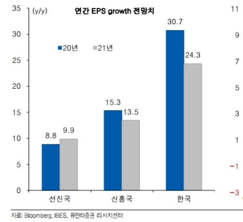 유안타증권에 따르면 올해 MSCI(모건스탠리캐피탈지수) 한국 지수의 EPS(주당순이익) 성장전망치는 최근 3개월간 +3.9%포인트 상향된 +30.7%를 기록하고 있다. 상향폭으로 보면 47개국 가운데 남아공 +4.0%p, 한국 +3.9%p 순으로 1, 2위에 랭크됐다. 레벨(수준)로 봐도 상위권이다. 터키 +41.7%, 파키스탄 +37.6%, 한국 +30.7% 순으로 3위를 기록중이다.