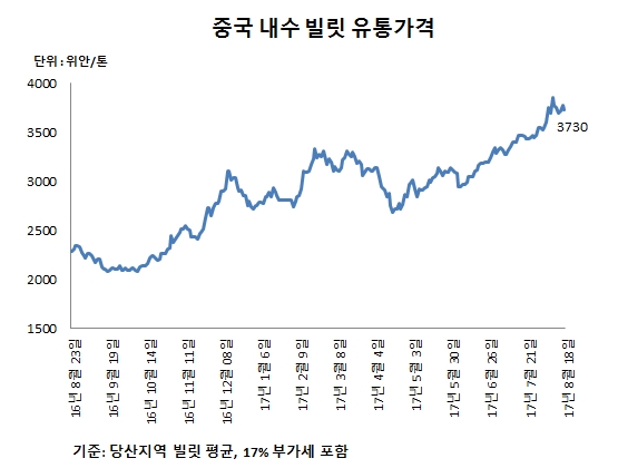 중국 내수 철근 유통가격은 톤당 4000위안(약 600달러, 17% 포함) 수준의 높은 시세를 유지하고 있다. 이에 빌릿가격이 추가로 하락 조정을 받을 가능성은 적은 것으로 분석되고 있다.