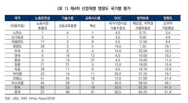 이미지 확대보기4차 산업혁명은 한국 경제에 분명 기회이나 국내 대응은 여전히 미흡한 수준이다. 스위스의 금융그룹인 UBS가 국가별 4차 산업혁명 적응력 순위를 조사한 결과(2016) 한국은 139개국 중 25위였다.