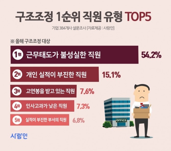 구조조정 대상은 '근무태도가 불성실한 직원'(54.2%)이 1위였다.