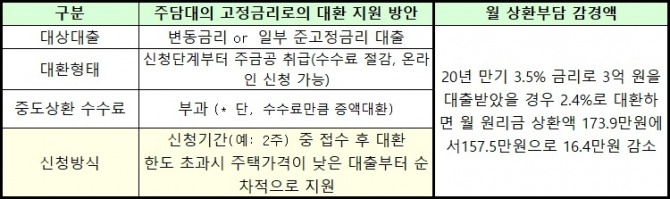 금융위에 따르면, 3.5% 금리로 20년 만기 3억 원을 대출 받은 사람이 대환 프로그램을 이용해 2.4% 대출로 갈아탈 경우 월 원리금 상환부담이 173만9000원에서 157만5000원으로 감소하게 된다.16만4000원이 감소하는 것이다.