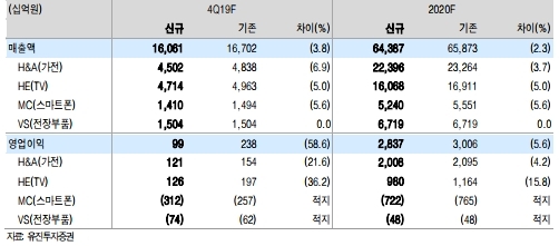 노경탁 유진투자증권 연구원은 "연말 소비시즌으로 프리미엄 가전과 TV 가 견조한 판매를 보이며, 매출은 성장했다”며 “그러나 LCD(액정표시장치) TV 시장의 경쟁심화와 초고화질TV 와 5G 스마트폰에 대한 마케팅 비용이 집중되면서 부진한 손익을 기록했다”고 말했다.