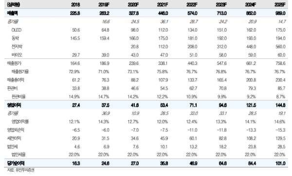 주력인 OLED(유기발광다이오드)의 실적개선도 호재다. 최대고객사인 삼성디스플레이의 2018년 모바일 OLED 패널 출하면적이 2021년까지 주요 세트업체들의 OLED 패널 수요 증가와 폴더블(접이식) 스마트폰 출시로 대폭 증가할 전망이다.