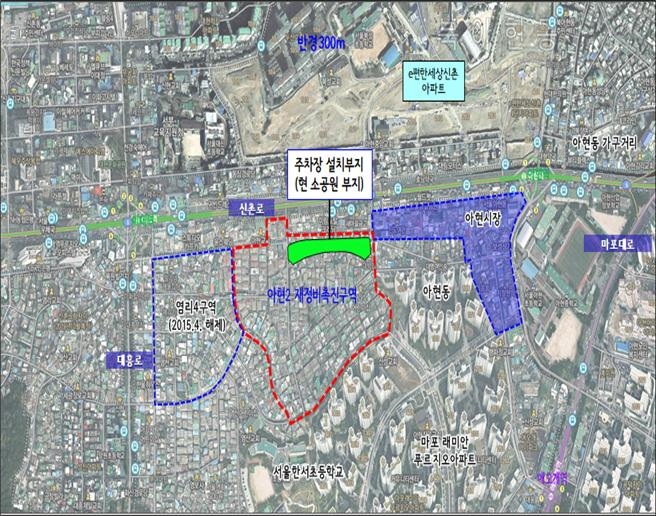 수정가결된 아현2 재정비촉진구역 지하 공영주차장은 지하철 2호선 이대역과 아현역 사이의 신촌로변 남쪽에 위치한 소공원(면적 4149.4㎡)과 도로(면적 1208.6㎡) 부지 지하에 설치될 예정이다.