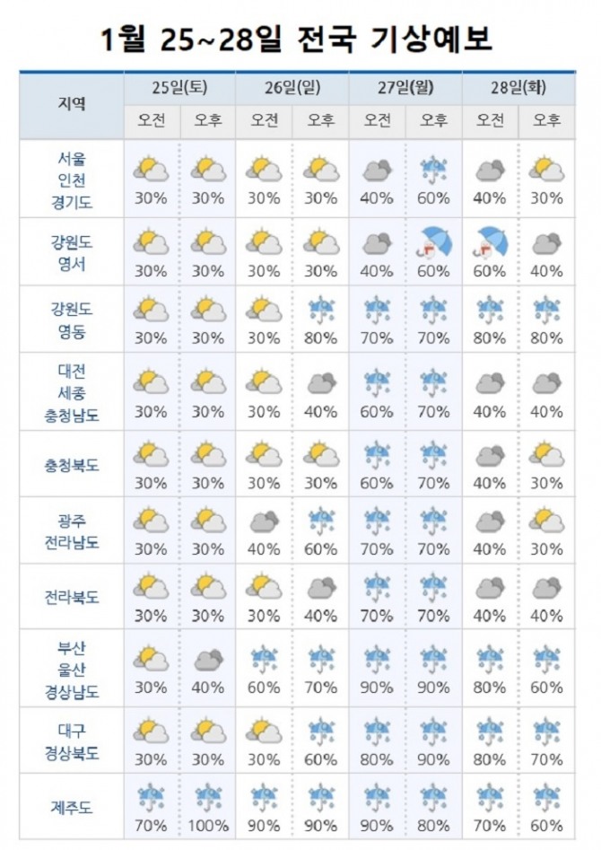 설날 당일인 25일은 전국이 가끔 구름이 많겠고, 제주도는 오전부터 빗방울이 떨어져 오후까지 이어질 전망이다. 부산과 울산, 경남 지역도 오후부터 비구름이 몰려들어 26일 비를 뿌리겠다.