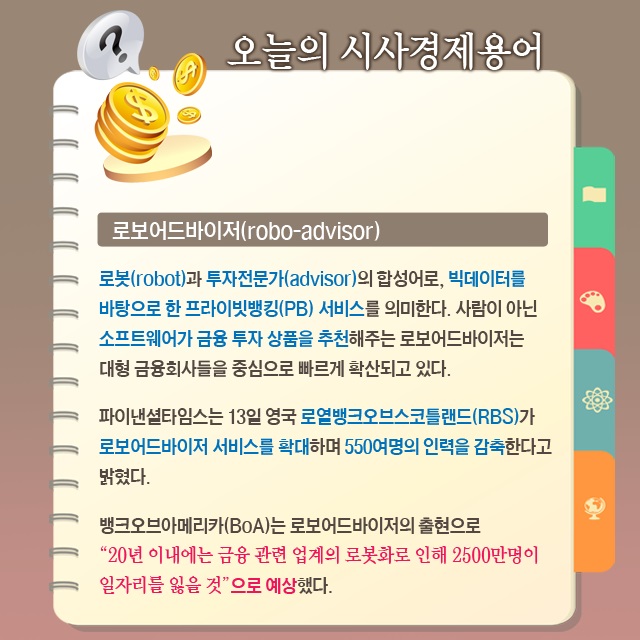 로보어드바이저(robo-advisor)란 로봇(robot)과 투자전문가(advisor)의 합성어로, 빅데이터를 바탕으로 한 프라이빗뱅킹(PB) 서비스를 의미합니다. 사람이 아닌 소프트웨어가 금융 투자 상품을 추천해주는 로보어드바이저는 대형 금융회사들을 중심으로 빠르게 확산되고 있습니다.