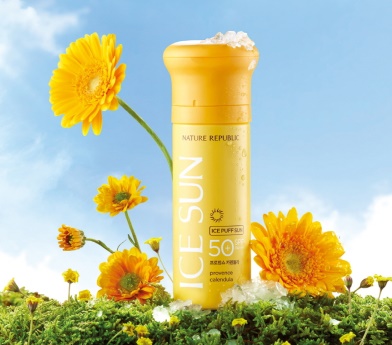 '프로방스 카렌듈라 아이스 퍼프 선 SPF50+ PA+++'는 태양의 움직임에 따라 꽃잎을 여닫는 '카렌듈라 추출물'과 하와이 코나 914m 해양 심층수를 함유했다.