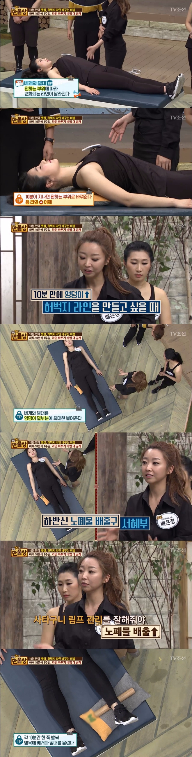 이미지 확대보기23일 밤 방송된 TV조선 '살림9단의 만물상'에서는 '10분 만에 바뀌는 내 몸의 기적' 편으로 거북목과 일자 허리를 고치는 '로카바도 운동법'과 베개와 밀대를 이용해 원하는 부위의 라인을 만드는 방법 등이 소개됐다.