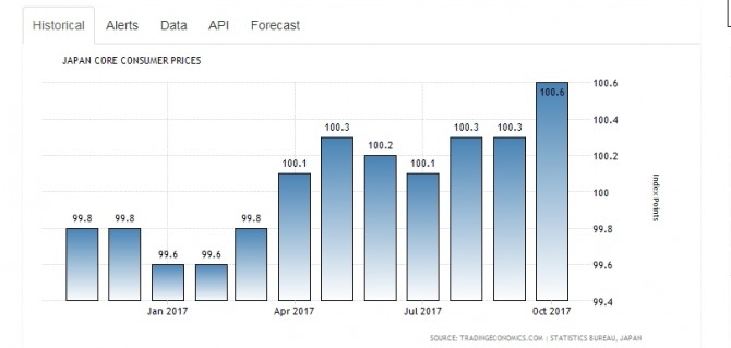 “The consumer price index for Japan in November 2017 was 100.9 (2015=100), up 0.6% over the year before seasonal adjustment, and up 0.7% from the previous month on a seasonally adjusted basis. The consumer price index for Ku-area of Tokyo in December 2017 (preliminary) was 100.8 (2015=100), up 1.0% over the year before seasonal adjustment, and up 0.3% from the previous month on a seasonally adjusted basis.”