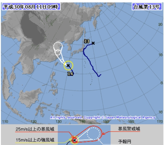 기상청은 또 내일(14일)은 동해상에 위치한 고기압의 영향으로 전국이 대체로 맑겠으나, 대기불안정에 의해 경북내륙에는 오후(15~18시)에 구름많고 천둥·번개를 동반한 소나기가 오는 곳이 있겠다고 일기예보했다. 제주도 남쪽해상을 지나는 기압골의 영향으로 제주도와 경남 남해안에는 새벽(03시)부터 아침(09시) 사이에 대체로 흐리고 비가 조금 오는 곳이 있겠다.