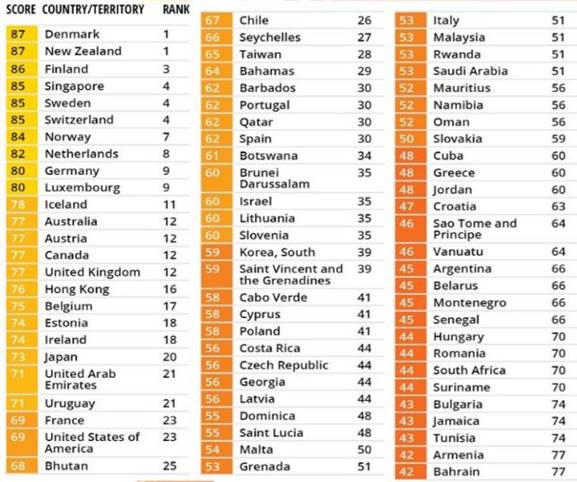 2019 세계 부패인식지수(CPI) 1위~77위