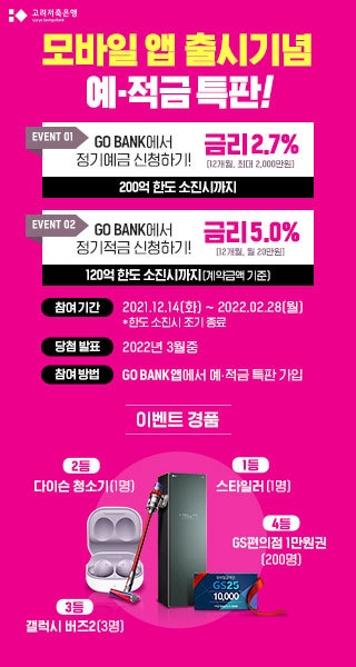 내년 2월28일까지 ··· 고 뱅크 정기적금'은 연 5% 금리 제공 · '고 뱅크 정기예금'은 연 2.7% 금리 제공