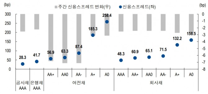 NH투자증권에 따르면 연초 이후 AAA등급 중 공사채 신용스프레드 축소 폭이 은행채나 회사채가 큰 것으로 나타났다. 펀더멘털이 양호하고 국채 대비 금리 매력이 높은 것은 물론 은행채 대비 순발행 규모가 작아 공급 측면에 우호적으로 작용한 탓이다.