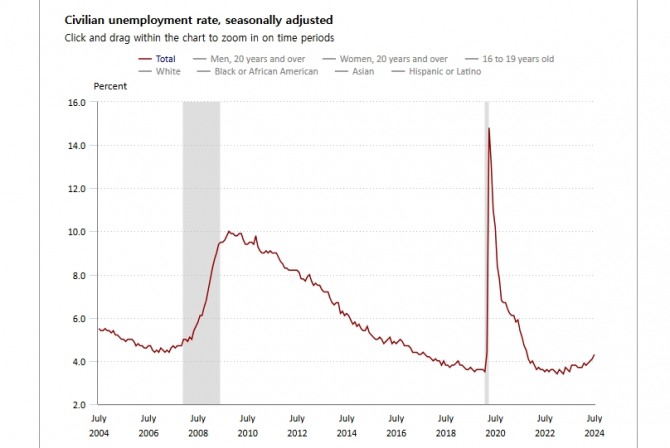 8월 초 뉴욕증시가 이른바 블랙먼데이 소동을 빚으며 주가가 크게 떨어진 것도 바로 그때 발표된 고용 보고서가 예상보다 더 부진해 경기침체의 우려를 낳았기 대문이다. 당시 노동부가 발표한 7월중 고용상황보고서에서는 신규 고용이 11만명대 실업률은 4.3%로 나타난 바 있다. 이 고용보고서 발표이후 뉴욕증시에서는 미국 경제의 침체가 임박했다는 우려가 커졌다.