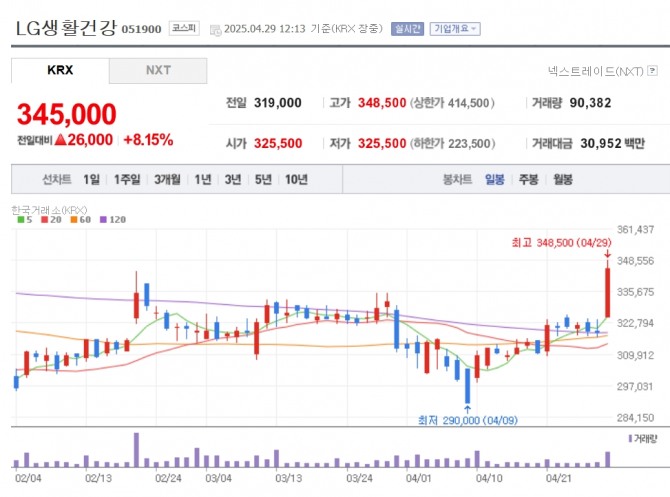 이미지 확대보기29일 한국거래소에 따르면 오후 12시 13분 기준 LG생활건강은 전 거래일 대비 8.15% 오른 34만 5000원에 거래되고 있다.