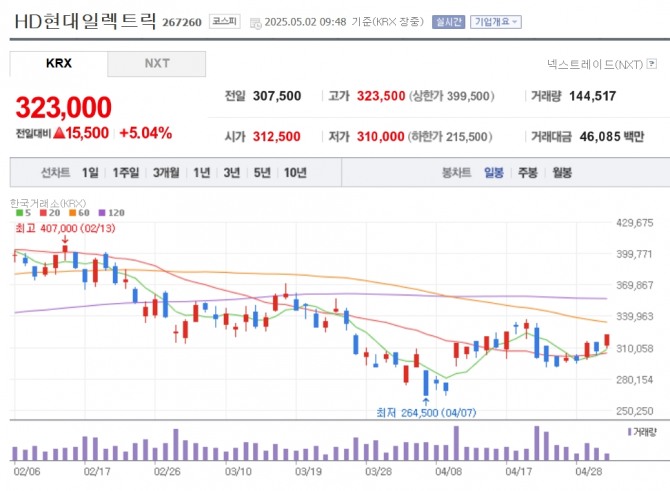 이미지 확대보기2일 한국거래소에 따르면 이날 오후 1시 37분 현재 HD현대일렉트릭은 전거래일 대비 5.85% 오른 32만5000원에 거래 중이다.