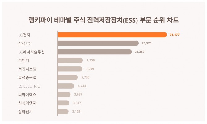랭키파이는 11일 테마별 주식 전력저장장치(ESS) 부문 부문의 통합적인 트렌드지수 순위는 물론, 성별 및 연령별 선호도를 함께 분석 발표했다.