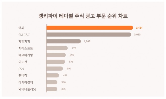 이미지 확대보기3121포인트를 받은 엔피가 테마별 주식 광고 부문 트렌드지수 1위에 올랐다. 이어 2위는 3053포인트가 나온 SM C&C(이)다.