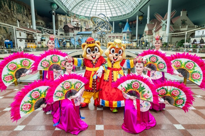 어드벤처 1층 퍼레이드 코스에서 오후 4시 40분에 진행되며, 민속 농악대의 흥겨운 연주와 손님도 함께 추는 ‘강강술래’가 어깨를 들썩이게 한다. 공연 말미에는 화려한 한복을 입은 연기자들과 함께 추석 인증샷을 남길 수 있는 손님 참여 포토타임도 준비된다.