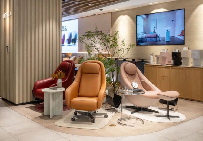 국내외 디자인 어워드를 석권하며 우수성을 인정받은 ‘비렉스 트리플체어’도 전시돼 있다. 업무·휴식·안마의 3가지 기능을 하나에 담은 다기능 체어로, 심미성과 실용성을 동시에 갖춘 것이 특징이다. 부드러운 곡선의 세련된 디자인과 잉크 블랙, 토프 베이지 등 5가지 고급스러운 컬러는 다양한 실내 인테리어와 자연스럽게 조화를 이룬다.