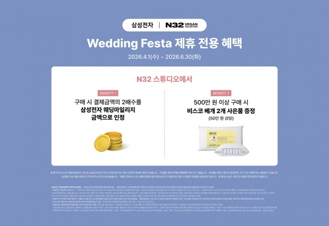 참여 방법은 간단하다. 삼성전자 웨딩 마일리지에 신규 가입한 뒤 삼성스토어 오프라인 매장에서 삼성카드로 총 1000만원 이상을 결제하면 자격이 주어진다. 이후 전국 N32 스튜디오에서 제품을 구입하면 결제 금액의 두 배에 해당하는 마일리지가 자동 적립된다. 500만원 이상 구매 고객에게는 시가 약 50만원에 달하는 비스코 스프링 베개 2개가 추가 증정된다.
