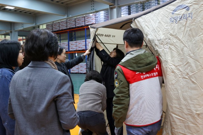 특히, 파주재해구호물류센터에 비축된 재난 유형별 구호세트, 대피소 쉘터, 특수구호차량 등 실제 구호 물자를 활용한 실습이 이뤄졌다. 교육생들은 대피소 운영을 실제 상황에 가깝게 체험하고, 이재민 구호 과정에서 발생할 수 있는 갈등을 해결하는 방안을 모색하는 등 실전 중심의 훈련을 진행했다.