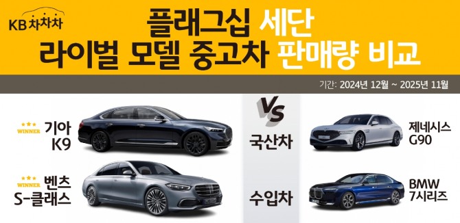 이미지 확대보기이번 분석은 지난해 12월부터 1년간의 판매 데이터를 기반으로 한 ‘플래그십 세단 라이벌 특집’으로, 국산차 부문에서는 제네시스 G90과 기아 K9을, 수입차 부문에서는 벤츠 S클래스와 BMW 7시리즈를 비교 대상으로 삼았다.