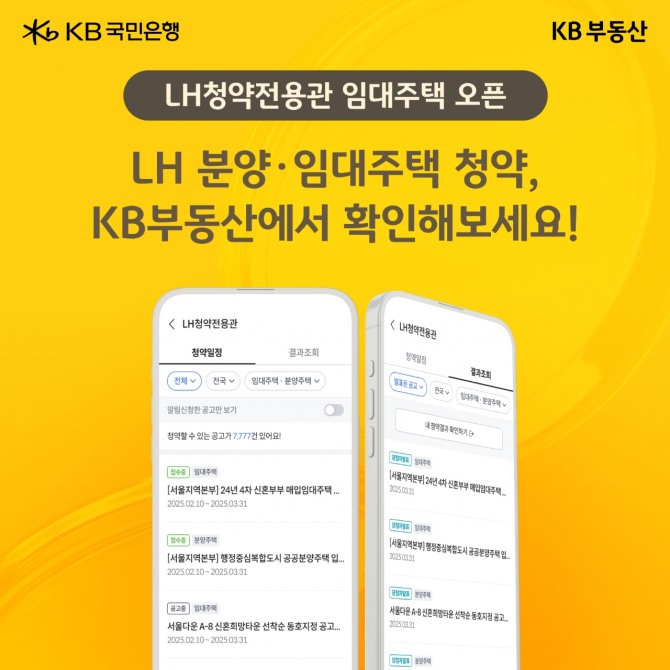 KB국민은행 관계자는 “고객이 다양한 공공주택 청약 정보를 보다 쉽고 편리하게 확인할 수 있도록 서비스 범위를 넓혔다”면서 “앞으로도 국민의 주거 안정과 편의성을 높일 수 있는 공공기관 연계 서비스를 지속적으로 강화해 나가겠다”고 했다.