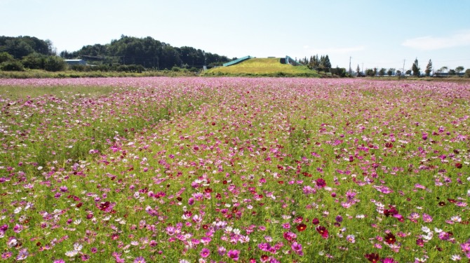 화창한 날씨를 보인 지난달 30일 담양군 담빛수영장 인근에 코스모스가 만개했다. 사진=담양군