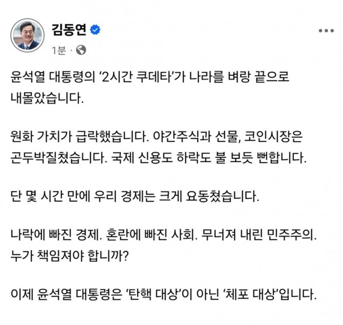 이어 "단 몇 시간 만에 우리 경제는 크게 요동쳤다"며 "나락에 빠진 경제, 혼란에 빠진 사회, 무너져 내린 민주주의, 누가 책임져야 하냐"고 따져 물었다.