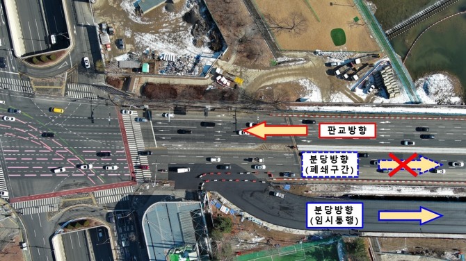 시는 원활한 교통전환을 위해 분당경찰서, 도로교통공단과 협의하여 방호벽과 펜스 등 안전시설물을 설치하고, 신호체계 개선, 차선 재도색, 가로등 이설을 완료했다.