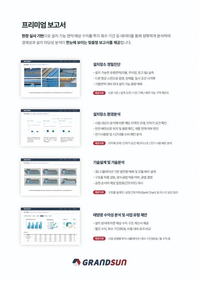 '프리미엄 보고서'는 실제 발전사업 추진 시 요구되는 전반적인 기술적 타당성을 검토해주는 보고서로, 태양광 도입을 검토 중인 사업자라면 실질적인 의사결정을 도울 수 있는 자료가 된다.