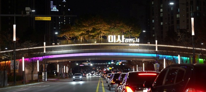 새롭게 조성된 경관조명은 ‘미사강변도시’ 브랜드 로고와 조화를 이루는 무지개빛 라인 조명이 다리를 감싸 도시적 세련미를 강조한다.