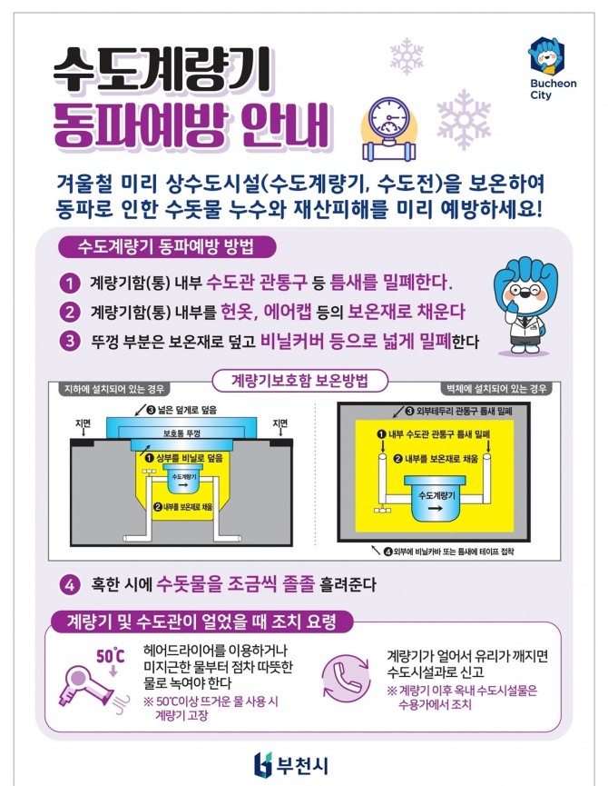 부천시 관계자는 “수도계량기 동파는 사전 예방이 무엇보다 중요한 만큼 시민의 관심과 참여가 필요하다”며 “시는 빈틈없는 대응체계를 유지해 동파로 인한 불편을 최소화하겠다”고 말했다.