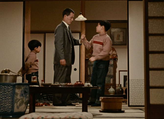 오즈는 후기작에서 코미디를 선택한다. '안녕하세요'는 웃음과 회복으로 끝난다. 비극조차 일어나지 않는 세상은 무의미한 말로 살아갈 뿐이다. 코미디야말로 시대의 공허함을 정확히 드러내는 형식이다. '안녕하세요'는 언어, 근대성, 공동체, 미디어에 대한 정밀한 사회 고발작이다. 이 영화 속에는 어느 누구도 악하지 않다. 모두 예의 바르고, 합리적이고, 상식적이지만, 아무도 서로를 이해하지 못한다. 오즈는 진심으로 서로가 안부를 묻는지를 질문한다.