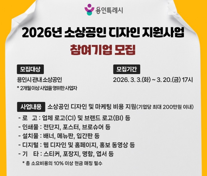 이미지 확대보기이들은 지역 소상공인의 브랜드 경쟁력 강화를 위한 ‘2026년 용인시 소상공인 디자인 지원사업’을 시행한다고 4일 밝혔다.