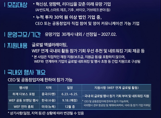 모집 대상은 인공지능, 반도체, 스마트 제조, 기후, 바이오, 거브테크 등 미래 산업 분야 기업으로, 누적 투자 30억 원 이상을 유치한 법인 중 최고경영자 또는 공동창업자가 직접 참여하고 영어 소통이 가능한 기업을 선발한다.