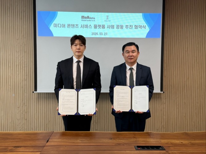 이미지 확대보기레쥬는 9일 AI 전문기업 모아데이타와 미디어 콘텐츠 서비스 플랫폼 공동 추진을 위한 업무협약(MOU)을 체결하고, 올해 상반기 정식 출시를 앞둔 통합 플랫폼 구축을 진행 중이라고 밝혔다.