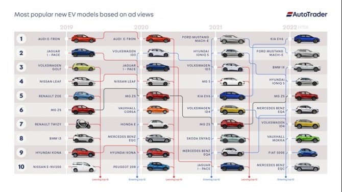 월평균 이용자가 6400만명에 달하는 영국 최대 온라인 자동차 거래 플랫폼 오토트레이더는 회원들이 주요 자동차 브랜드의 광고를 조회한 결과를 분석한 결과 기아 EV6가 1위를 차지했고 현대 아이오닉5가 4위를 기록했다고 19일(이하 현지시간) 펴낸 ‘2030년 내연기관차 퇴출로 가는 길(The Road To 2030)’이라는 제목의 보고서에서 밝혔다.
