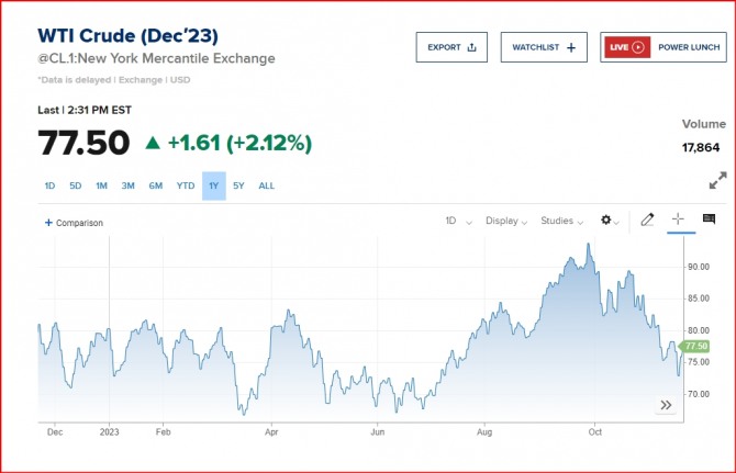 뉴욕증시 일각에서는 OPEC+의 생산 목표를 더 많이 삭감함으로써 선물 가격이 다시 100달러대로 갈 수 있다는 경고까지 나오고 있다. 실제로 사우디아라비아는 감산을 내년까지 연장하는 것을 검토하고 있다. 석유수출국기구(OPEC) 플러스(+) 차원의 추가 감산도 검토 중이다. 국제유가를 끌어올리기 위한 카드다. 아울러 이스라엘과 하마스 전쟁으로 가자지구 주민들의 희생이 커지면서 중동산유국 내부에서 주민들의 반발이 심해지는 가운데 서방을 압박하기 위한 전략으로 다시 감산 카드가 나왔다. 파이낸셜타임스(FT)는 사우디가 하루 100만배럴 감산을 내년 봄까지 연장할 가능성이 높다고 보도했다.